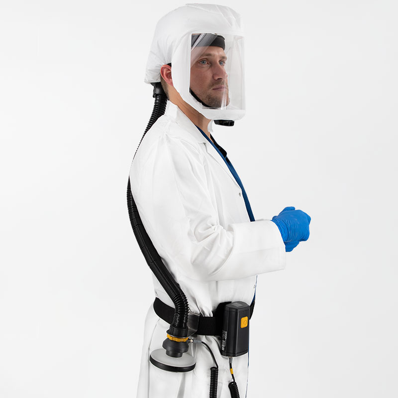 In Verbindung mit einer geeigneten Luftquelle (Gebläsefiltergerät oder Druckluft) wird ein konstanter Überdruck innerhalb der Haube aufgebaut, wodurch das Eindringen von Schadstoffen zuverlässig verhindert wird.